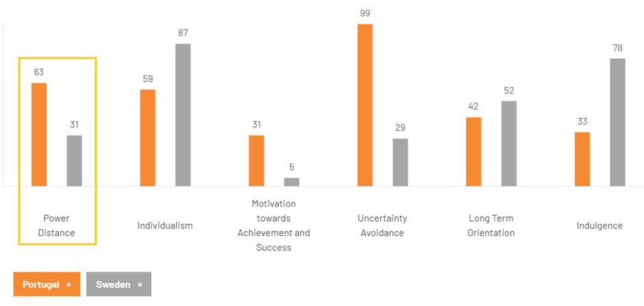 Hofstede Insights [6] provides a comparative analysis of different cultures in several dimensions, and in particular there is one that sets the Portuguese culture apart from others in Northern Europe. It is called “power distance” and it pertains to how hierarchical leadership is perceived and exercised. In the Portuguese case it is described as follows.