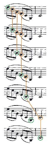 In this image you can see the same sequence of notes in time, the notes stopped already by the left hand fingers in waiting (orange) while the green note is being played.