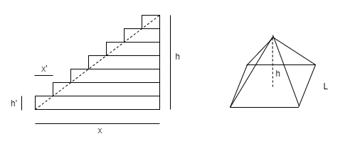 In a pyramid, the base side will be L = 2x, so x’ = L h’ / (2 h).
